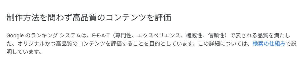 簡単に説明すると、どんな人が書いているか?体験はあるか?個人の意見感想はあるか?という点を重視するとGoogle社は指摘しており、AI記事生成ツールを使ってコピペをするだけでは、不十分です。