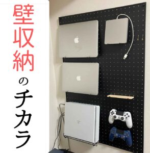 メインのパンチングボードです。ベースとなる土台をケチらない方が良い。わたしの場合は約3kgあるPS4、1kg-2kgあるノートPCを2台壁に掛ける必要があるので最低でも対荷重10kgは欲しい。